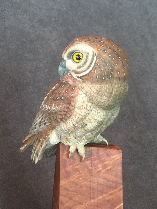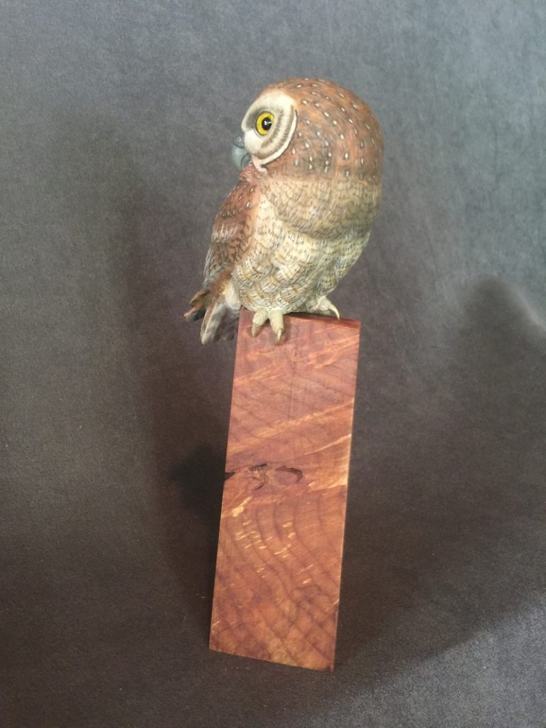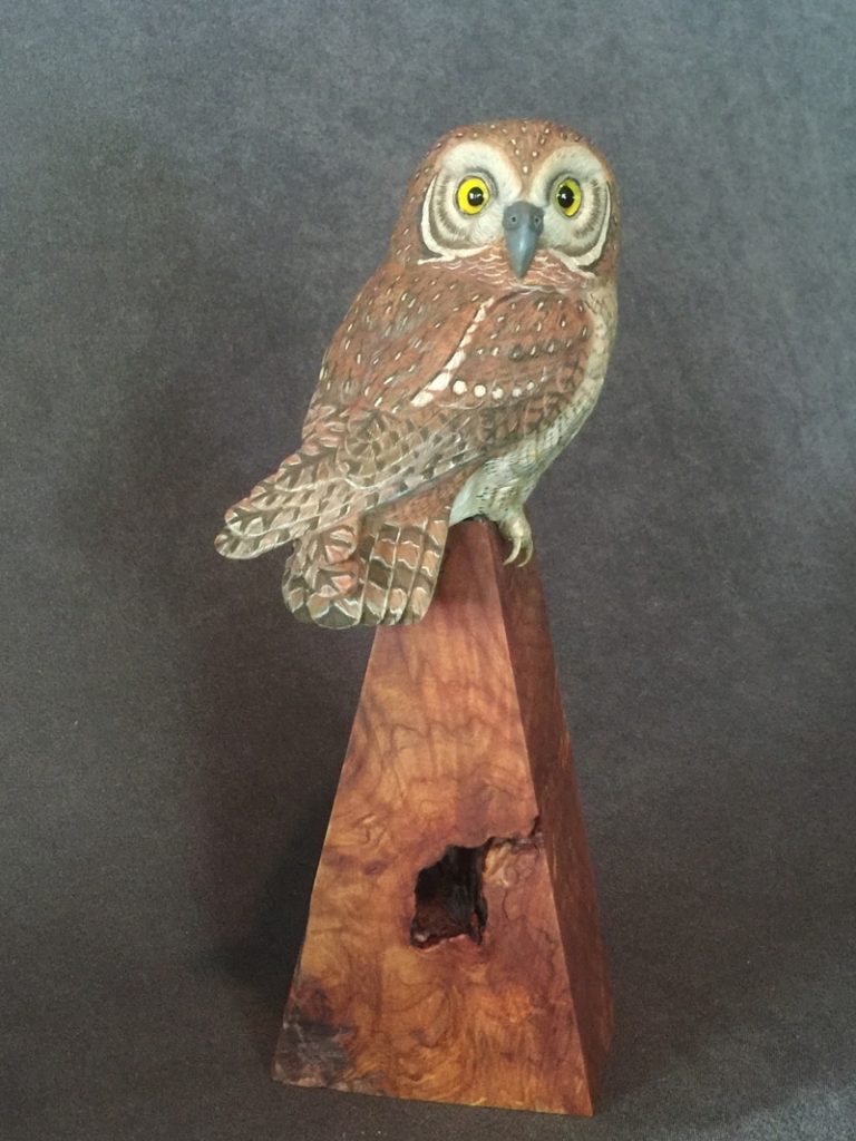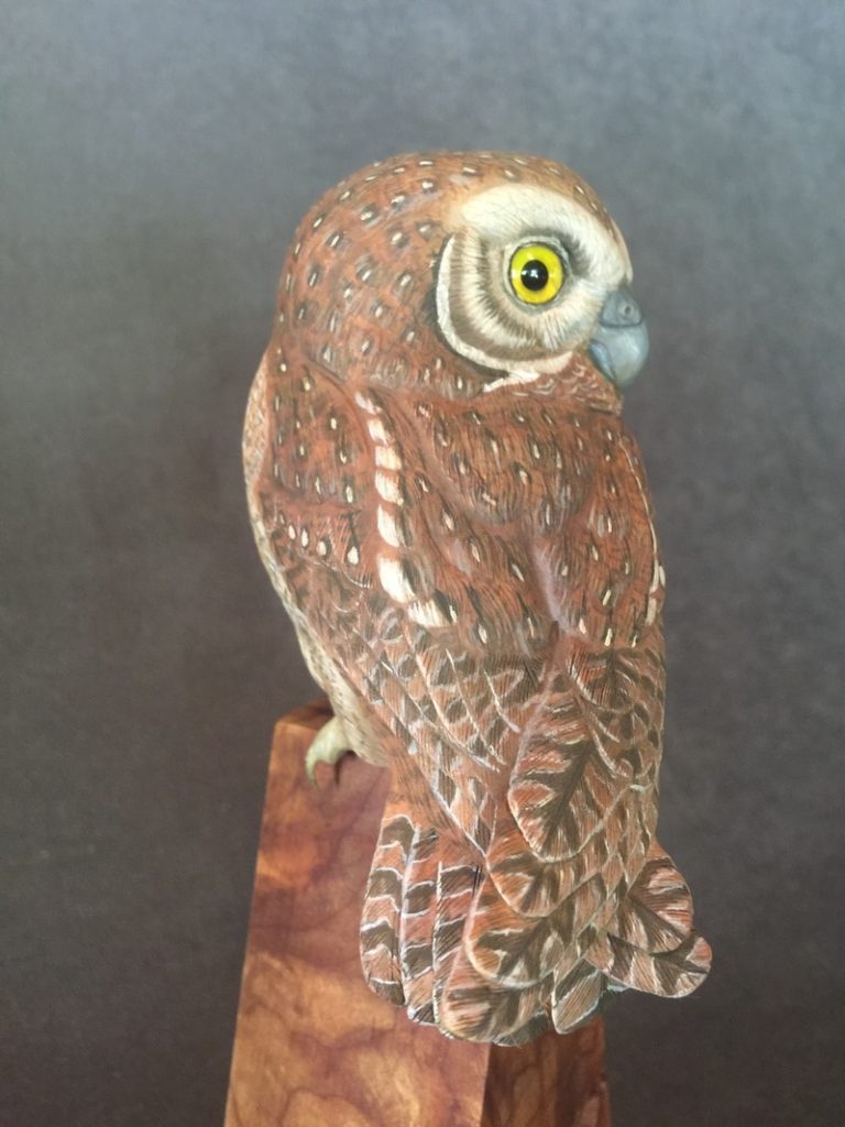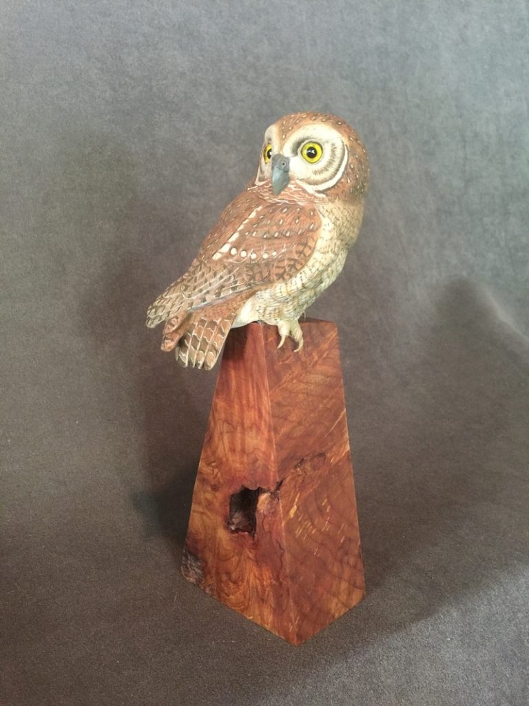One of a kind Life Sized Elf Owl, Carved out of Tupelo Wood, Painted with Acrylics, Glass Eyes,